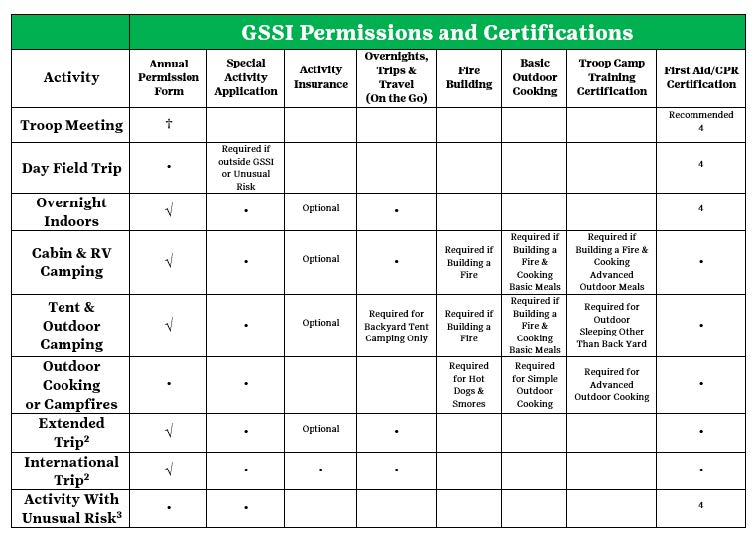 GSSI must also have copies of the Annual Permission Form for girls and the Annual Adult Participation Agreement for adults attending the meeting or activity.