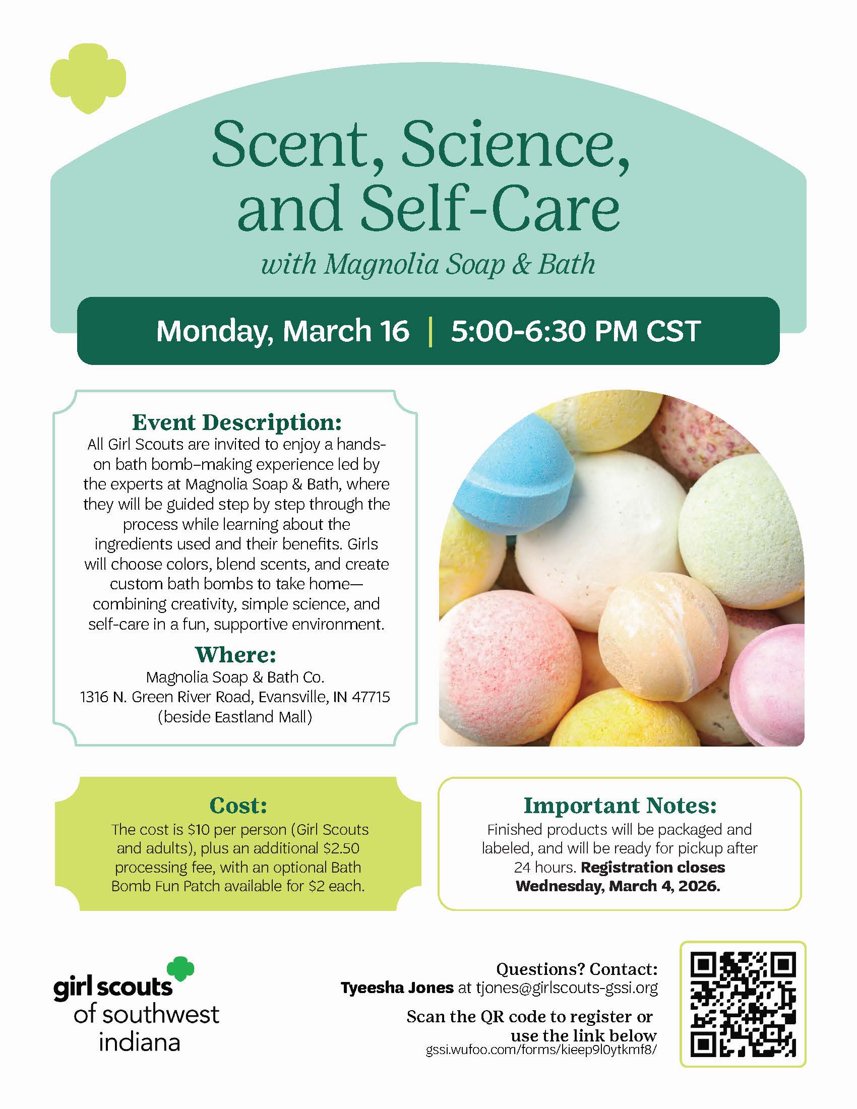 Girl Scouts are invited to take part in a hands-on bath bomb making experience led by Magnolia Soap and Bath Co. staff. Girls will be guided step-by-step through the bath bomb making process while learning about the benefits of the ingredients used. They'll be able to choose from multiple colors, mix different scents, and create custom bath bombs to take home and relax with. This workshop blends creativity, science, and self-care in a fun and supportive environment!